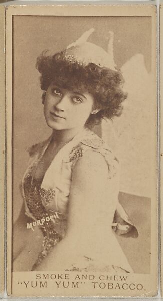 Trade card from the "Actresses" series (N402), issued ca. 1888 by Aug. Beck & Co. to promote Yum Yum Tobacco. Brand name on lower border: SMOKE AND CHEW/ "YUM YUM" TOBACCO. Various backs include redemption offers stamped in purple ink or printed in black with August Beck & Company name or blank backs.