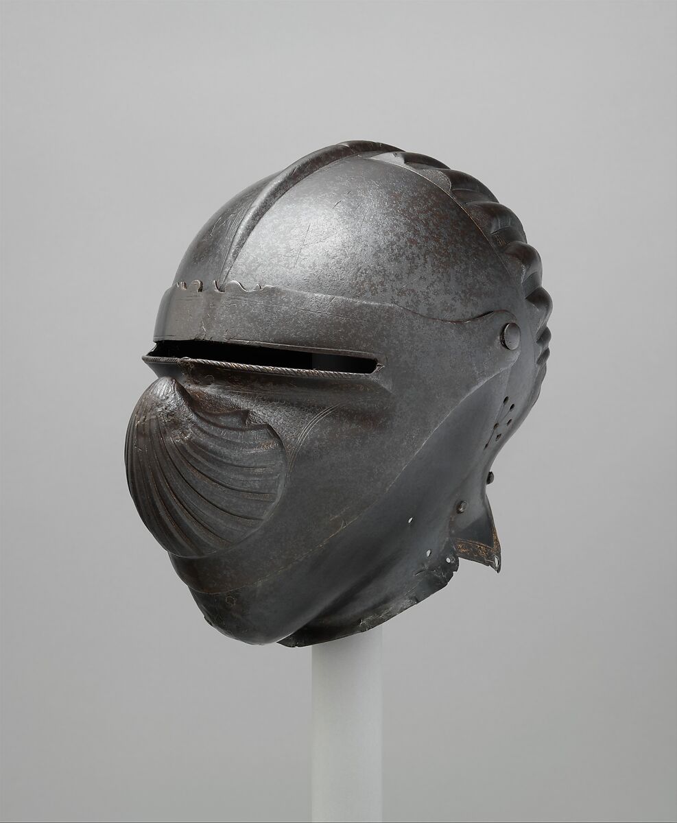 It is also a rare example of Italian armor made in the German style (alla tedesca), presumably for export north of the Alps or for an Italian client with northern tastes. Unlike the standard type of Italian cavalry helmet, which is constructed with cheekpieces hinged to the lower edge of the bowl, it has a visor and a bevor designed to rotate on common pivots at the sides of the bowl, in the manner of most German examples of the period. In this, it may be compared to a backplate decorated with flutes in the German fashion, which bears the marks of Francesco Negroli, in the Metropolitan Museum’s collection (acc. no. 2014.154).