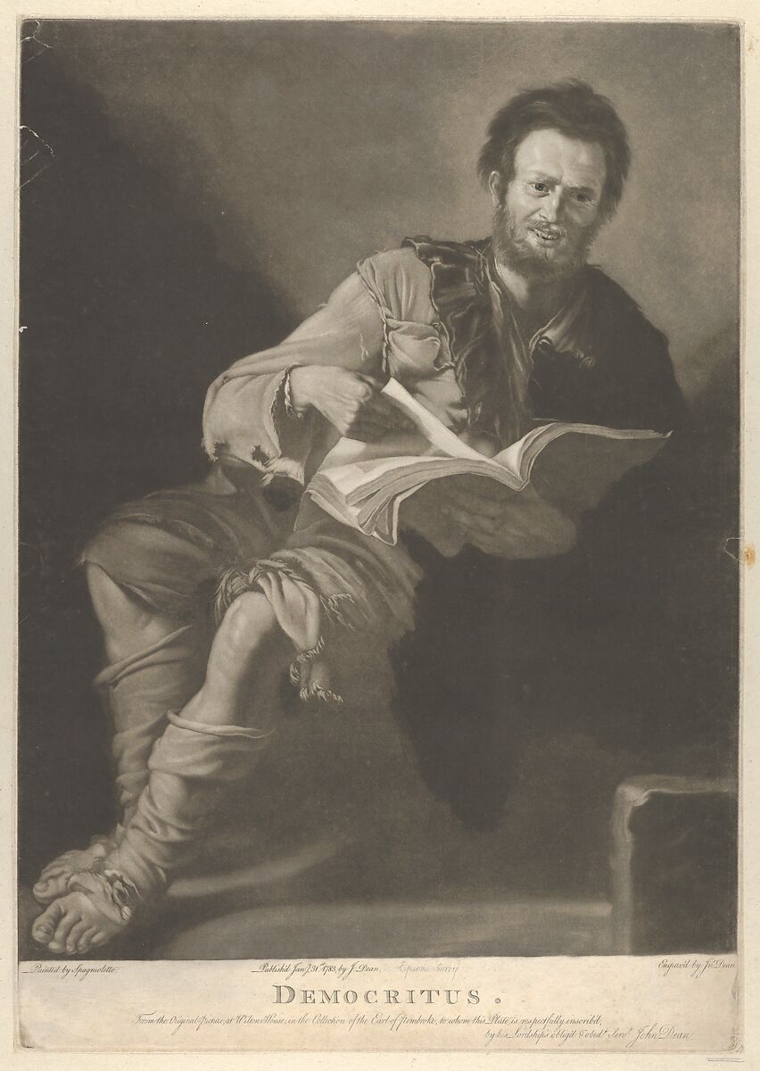 - Title: Democritus, seated, holding a book and looking towards the viewer