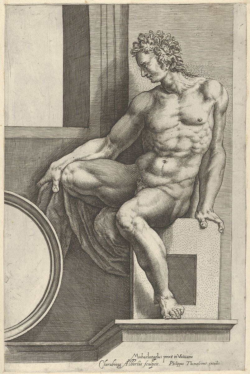 - Title: A naked man (Ignudo), seated facing left, holding a piece of fabric, after Michelangelo's 'The Last Judgment' fresco in the Sistine Chapel