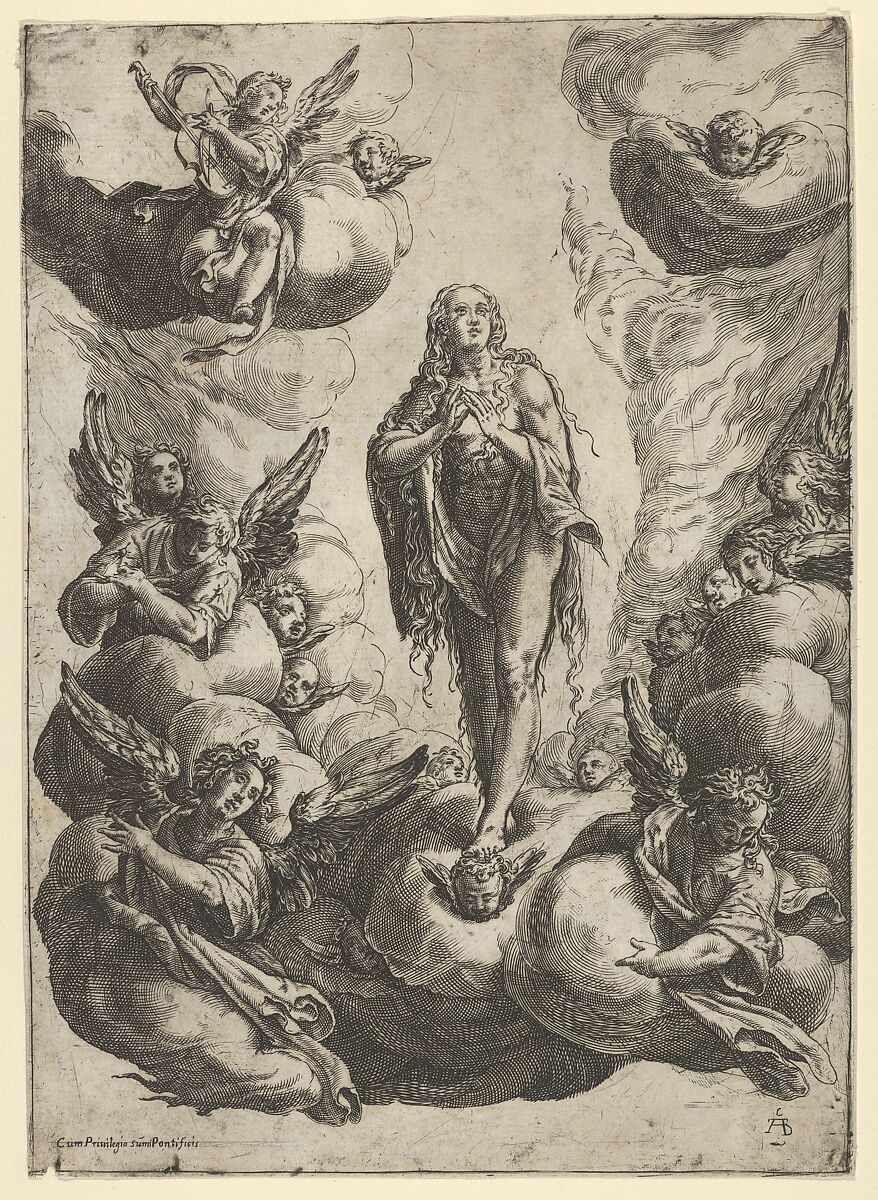 - Title: Mary Magdalen standing on clouds, being transported to heaven by angels
