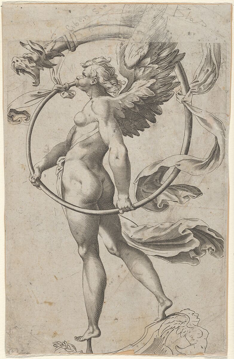 - Title: A winged figure of Fame standing facing left and sounding a trumpet