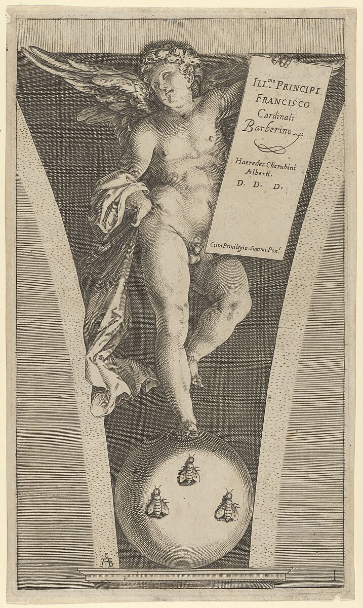 - Title: Winged genius holding a tableau, standing on a sphere with three bees