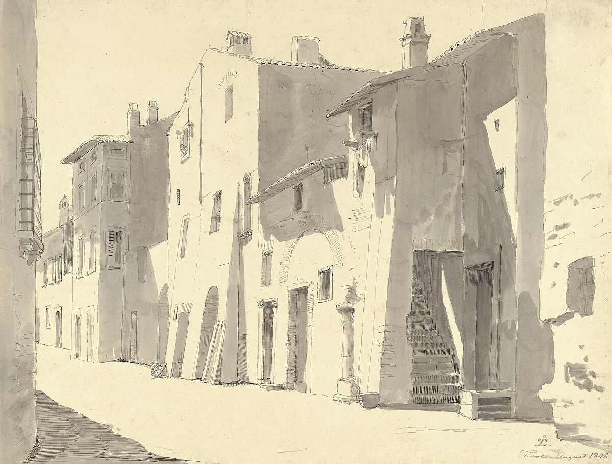 Læssøe enrolled at the Royal Academy in 1834, but did not regularly attend classes; he is also known to have been tutored by Christen Købke for a short time. Living abroad in Rome, where he moved in 1844, Læssøe made drawings and paintings that demonstrate his passion for his adopted land. This wash drawing is a study of light and shade and shows a meticulously rendered, narrow and imperfect street in Tivoli, a town just outside Rome, baked by the sun.