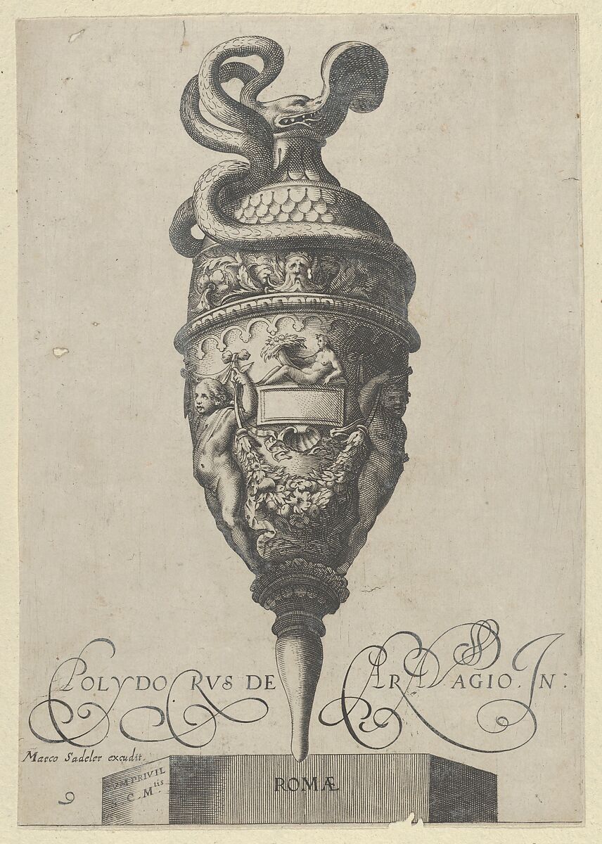 - Title: Plate 9: Vase or Ewer with a Serpent Handle and Two Putti holding up a Garland, from "Antique Vases" (Vasa a Polydoro Caravagino)