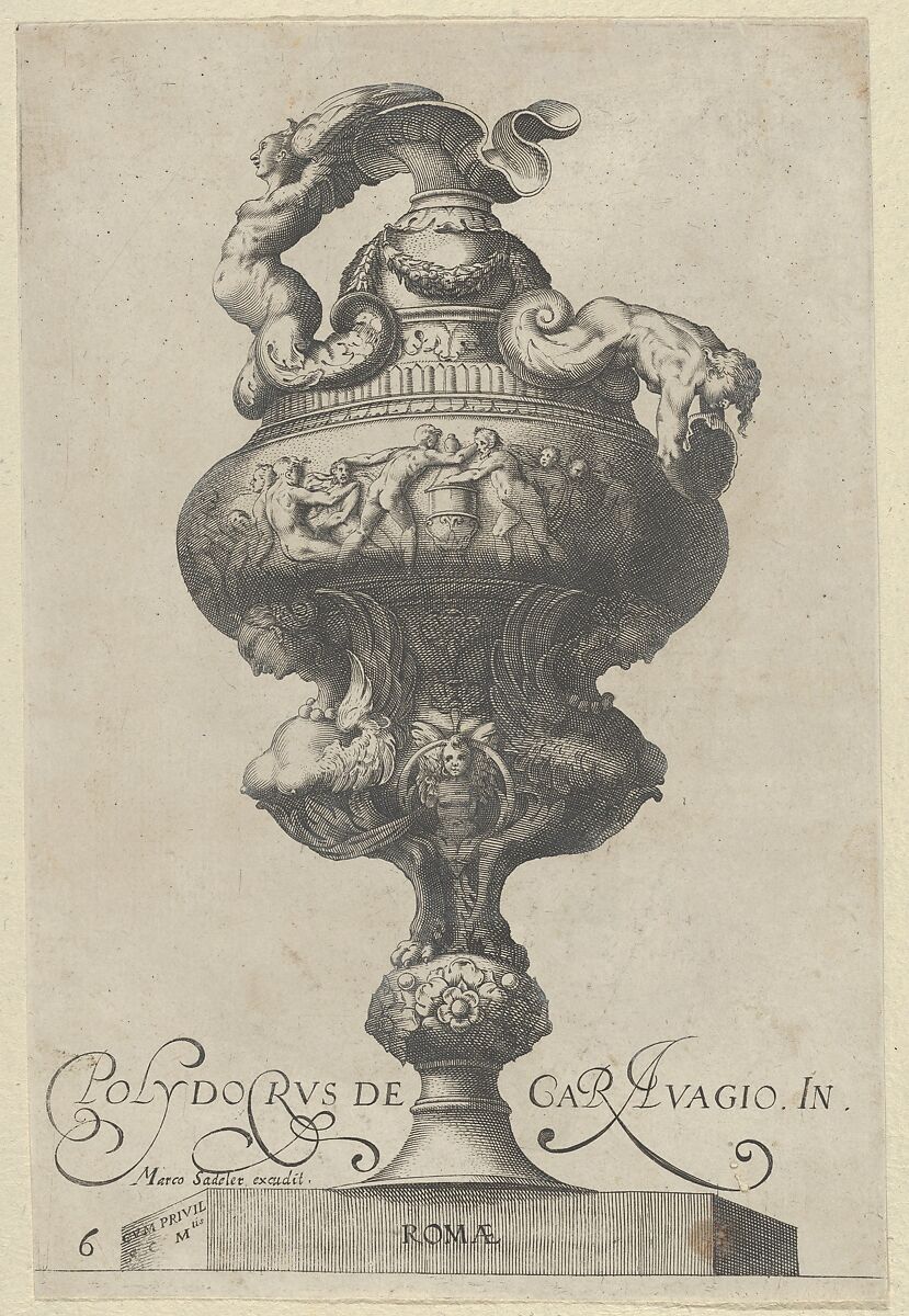 - Title: Plate 6: Vase or Ewer with a Frieze Containing Naked Figures, Supported Below by Two Female Sphinxes, from "Antique Vases" (Vasa a Polydoro Caravagino)