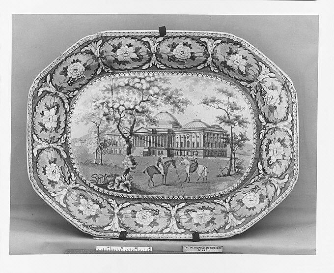 This dark blue and white transfer-printed earthenware platter made by the Staffordshire firm of John & William Ridgway features a view of the United States Capitol building in Washington, District of Columbia. The view belongs to a series of approximately twenty-two views with borders of rose-filled leaf-shaped oval medallions titled "Beauties of America" produced for the United States export market. The series records important nineteenth-century hospitals, colleges, churches, libraries and other public buildings from Massachusetts to Georgia. As a symbol of American political power with obvious appeal to patriotic American consumers the Capitol was a popular subject for transfer-printed export wares. Designed and constructed in several stages from 1793 to 1830 by Philadelphia architects William Thornton (1759–1828) and Benjamin Henry Latrobe (1764–1820) and Boston architect Charles Bulfinch (1763–1844), the Capitol was also admired as a monumental example of American neoclassical architecture. Ridgway's view captures the building when it was still a work in progress with the final central dome designed by Philadelphia architect Thomas Ustick Walter (1804–1887) to be added later from 1855 to 1865. Other views of the Capitol in the same unfinished state decorate a platter, 14.102.65, by William Ridgway & Co. (ca. 1834–1854) and a plate, 14.102.131, by Ralph Stevenson & Williams (ca. 1825–1827). The views by John & William Ridgway and Ralph Stevenson & Williams were based on a drawing by little-known artist H. Brown, engraved by Fenner, Sears & Co., and reproduced as "Capitol of the United States, Washington" in John Howard Hinton's "The History and Topography of the United States of North America" (London, 1830 and 1832). The American Wing’s collection contains additional pieces by John & William Ridgway. Refer to the Dictionary for a definition of the term "transfer printing" and for information about Ridgway and the other above-mentioned firms.