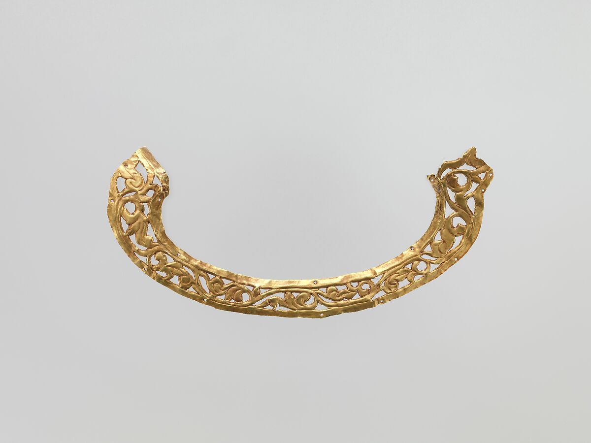 The nomadic communities of Central Asia used such plaques to embellish clothing and horse trappings. As these nomadic cultures herded animals and were constantly moving, their artistic production was expressed in portable objects that marked the wearer’s status and wealth. The outstanding preservation of these fragile ornaments suggests they were used in conjunction with burials, where the body was aggrandized with valuable textiles and augmented with gold. Although it is difficult to date and place these objects geographically, their presence in Central Asia and has a long, established history.