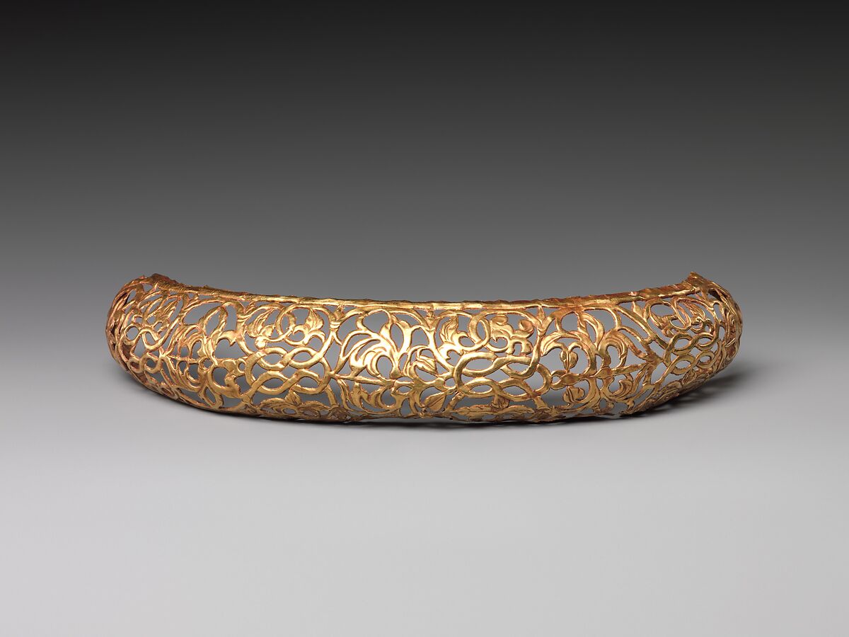 The nomadic communities of Central Asia used such plaques to embellish clothing and horse trappings. As these nomadic cultures herded animals and were constantly moving, their artistic production was expressed in portable objects that marked the wearer’s status and wealth. The outstanding preservation of these fragile ornaments suggests they were used in conjunction with burials, where the body was aggrandized with valuable textiles and augmented with gold. Although it is difficult to date and place these objects geographically, their presence in Central Asia and has a long, established history.