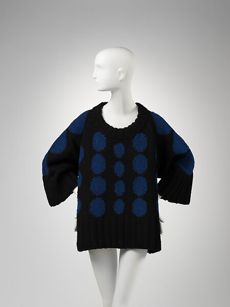This hand-knit sweater by Marc Jacobs dates from his student years (ca. 1984) at Parsons The New School for Design, before his first professional venture in 1986. The all-over polka dot pattern shows some similarity to the ‘Smile’ sweater (2009.80), which features the yellow smiley often patched onto garments by 1980s club kids and ravers.