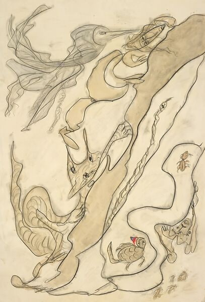 Featuring a procession of figures and animal-like forms (including a flag-waving turtle), this drawing commemorates the inauguration of President Barack Obama. A striped creature with claws occupies the lower-left corner and stretches into the center of the composition. Its markings identify it as a tiger, an animal Dial adopted in his art as a recurring symbol of various underrepresented groups’ struggles for survival and social justice. The artist’s initials appear near a man’s face with a mustache, suggesting a self-portrait and his imaginary presence at this celebration.