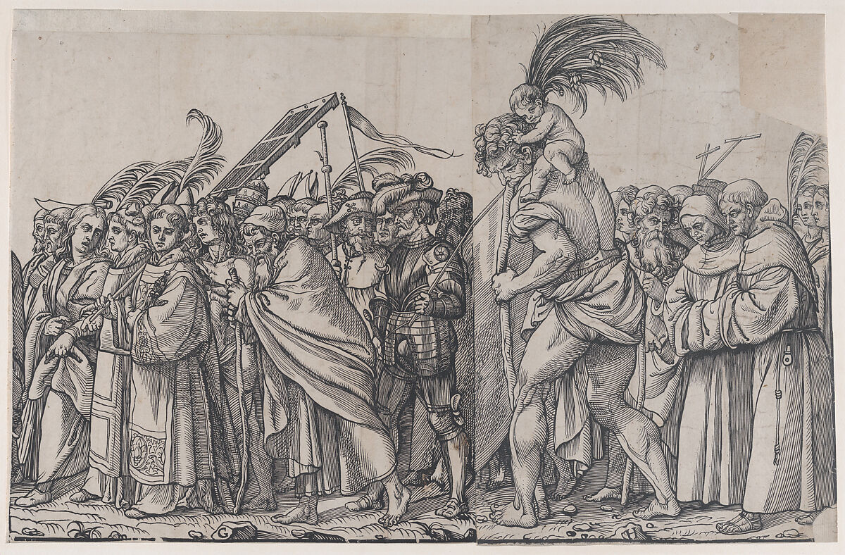 This print is from a scrapbook (album) containing woodcuts and chiaroscuro prints. It was presumably taken apart when it was acquired by The Met in 1922. On the front page of the volume there appeared a statement that this collection was made by the poet Samuel Rogers (1763-1855) and then bought by Angela Coutts (1816-1906) in memory of him at the sale of the collection at his house (28 April – 20 May, 1856). #1615a Rogers Sale. #146 Burdett Coutts Sale (Sotheby’s, May 1922). The prints from the original album have the range 22.73.3-1–22.73.3-161.