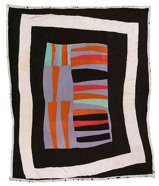 The bold design and harmoniously clashing color palette of this Medallion quilt exemplify some of the qualities that made works from Gee’s Bend a sensation when they were first introduced to art museum visitors in 2002. While often equated with abstract paintings by white men, these quilts are solely the products of the needs and aesthetics of the African American women who made them. In this case, Loretta Pettway composed a thrilling design through clever improvisation with a simple block form. She created six blocks with multicolored strips of fabric, and then stitched three together with the strips arranged horizontally and three with the strips turned vertically. The juxtaposition of the blocks creates a jarring rhythm that pleases the eye, and the black and white borders add to the sophistication of the design.