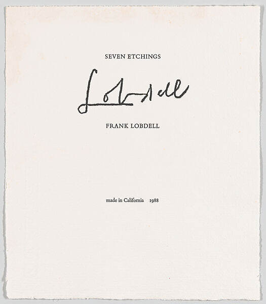 Seven hardground etchings printed by David Kelso at made in California press. Title and colophon sheets designed and letterpress printed in Bembo by Ann Rosener at Occasional Works. Etchings and title and colophon sheets loosely bound in gelatin gray fabric portfolio by the Schuberth Bookbindery.