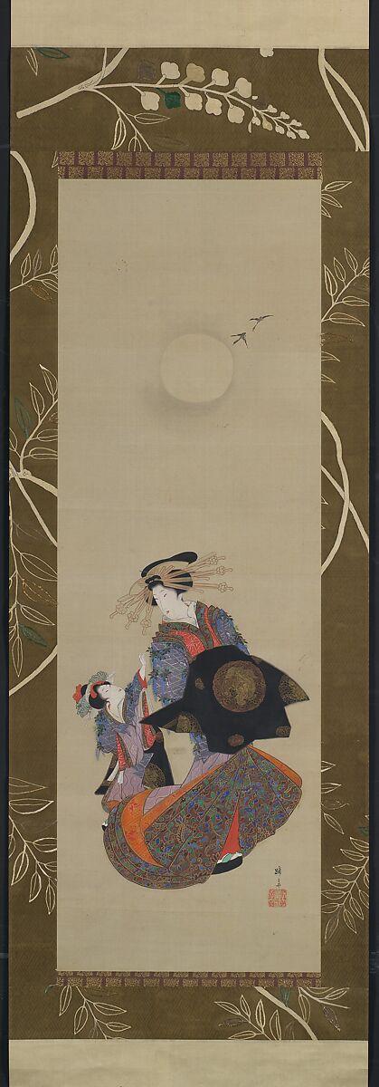 Among the most splendid sights and sounds of the Yoshiwara pleasure quarters was that of an elaborately dressed courtesan in procession with her entourage and the clattering cadence of their footsteps in high, lacquered clogs. This beauty's sumptuous, lavender-colored outer garment featuring three-dimensional wisteria blossoms is worn over layered robes, all rendered in extraordinary detail, including an elaborate obi decorated with a lion and peonies in gold. Her coiffeur boasts an assortment of tortoiseshell combs and long hair ornaments. Only the full moon, a pale orb rendered against faint washes of ink, and two geese in flight in the upper section of the scroll suggest an outdoor evening setting. The artist Teisai Hokuba, a principal student of Katsushika Hokusai, produced many surimono prints and was highly skilled in the minute depiction of details.