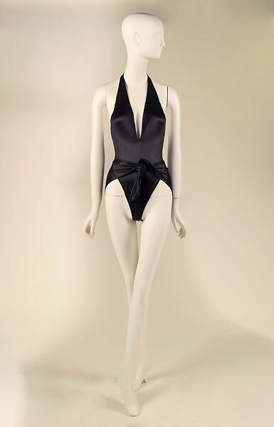 Halston is best known for his application of innovative patterning techniques in the construction of near-seamless bias cut gowns and for the promotion of ease and wearability in designs for shift dresses and suits. In the mid-1970s, the designer began to apply his eveningwear aesthetic to a wide range of ready-to-wear clothing, including swimwear. This bathing suit, titled “Savage,” incorporates the plunging neckline typical of many of the designer’s gowns. The customizable garment, composed of one continuous piece of fabric, is passed through the legs, wrapped around the waist, and tied to fit.