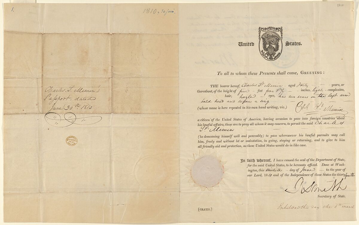 Issued to the artist Charles de Saint-Mémin, this passport describes him as aged forty, five feet 4 1/2 inches tall, with a light complexion, hazel eyes, two scars on his left arm, and a bald head usually covered with a wig. After an education at the École Militaire in Paris, Saint-Mémin left France with his family during the Revolution, first for Switzerland, then New York (arriving in 1793, they intended to move on to a family estate in Sainte Domingue (now Haiti), but were prevented by the uprising on that island). To support the family, Charles became a self-taught portraitist and specialized in profiles, often produced with the help of a physiognotrace. His subjects included John Marshall, Thomas Jefferson and George Washington. This document indicates that the artist became a United States citizen during this period. Returning to France in 1814, he became director of the Musée des Beaux-Arts in Dijon.