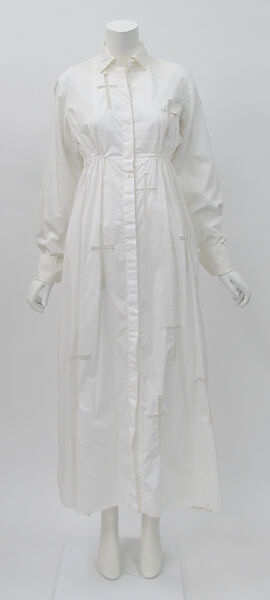 Tunisian-born French designer Azzedine Alaïa was well known for pairing sophisticated couture skills with influences of traditional, regional or ritual dressing codes. This poplin shirtdress in particular references the symbols and rituals of the Catholic Church. The style of the shirtdress with an elastic drawstring recalls the empirical line of baptismal gowns or the habits typically worn by nuns and nurses. The bib-shaped placket also recalls a nun’s habit. The poplin or broadcloth is a typically humble material, symbolizing nuns’ piety, and contrasts with the luxurious mousseline insets and the mother-of-pearl buttons, which are more festive and more in line with baptismal gowns.