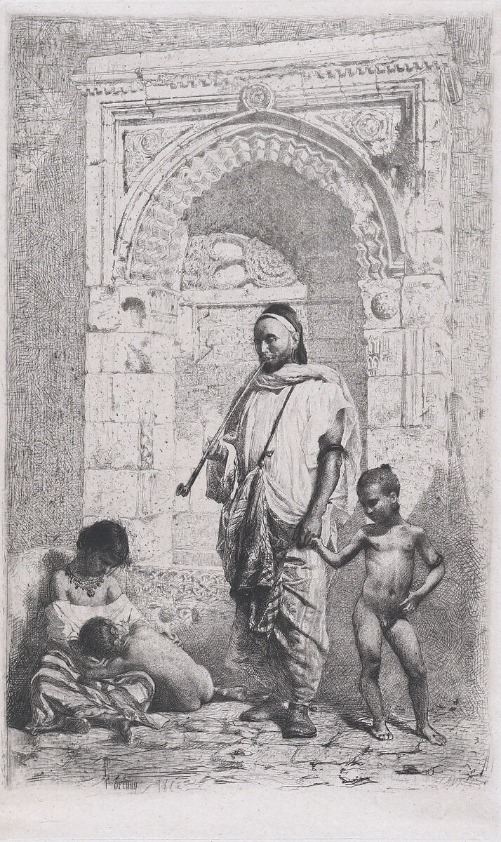 - Title: A Moroccan family in front of an arch, father standing, mother lower left on the ground holding a child