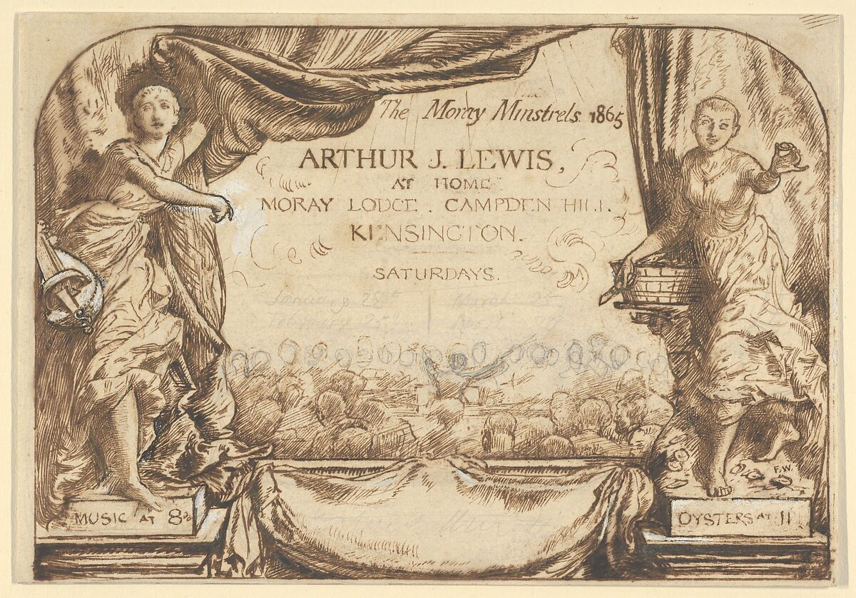This design for a printed invitation was created for the well-to-do silk merchant Arthur James Lewis who, before his 1867 marriage, regularly welcomed male friends to Moray Lodge, his home on Campden Hill, overlooking London's Holland Park. Once a month, between January and March, singers would gather on Saturday evenings at 8:30 pm to perform modern and ancient works; with oyster suppers served at eleven. Lewis was himself an amateur artist who joined the Junior Etching Club and welcomed London artists, such as J. M. Whistler, to his home. The invitation captures the jolly informality of Lewis's entertaining (see 58.503.2 for the related print).