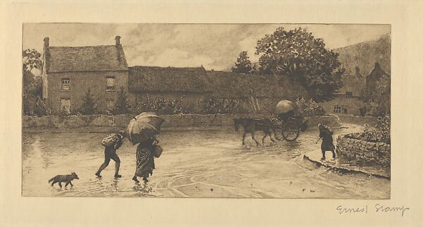 A woman, boy and dog hurry through a downpour in the Berkshire village of Cookham, with houses lining the road and a horse and cart approaching. The composition derives from a watercolour of ca. 1871 (Victoria and Albert Museum), and an impression of the print was shown at the Royal Academy of Arts, London in 1894. Stamp manipulated his medium in masterly fashion to convey the misty dampness and muted tonality of the subject.