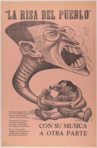 The titles of various Mexican daily newspapers, all of them pro-Franco, are inscribed on the neck of the pipe. The head acting as the trumpet represents the editor Miguel Ordorica, whose name is emblazoned across his forehead. He wears a swastika earring to demonstrate his support for Fascism. Spitting from his mouth are the words ‘provocación’ (‘provocation’), ‘calumnia’ (‘slander’), ‘insultos’ (‘insults’), ‘mentiras’ (‘lies’).
