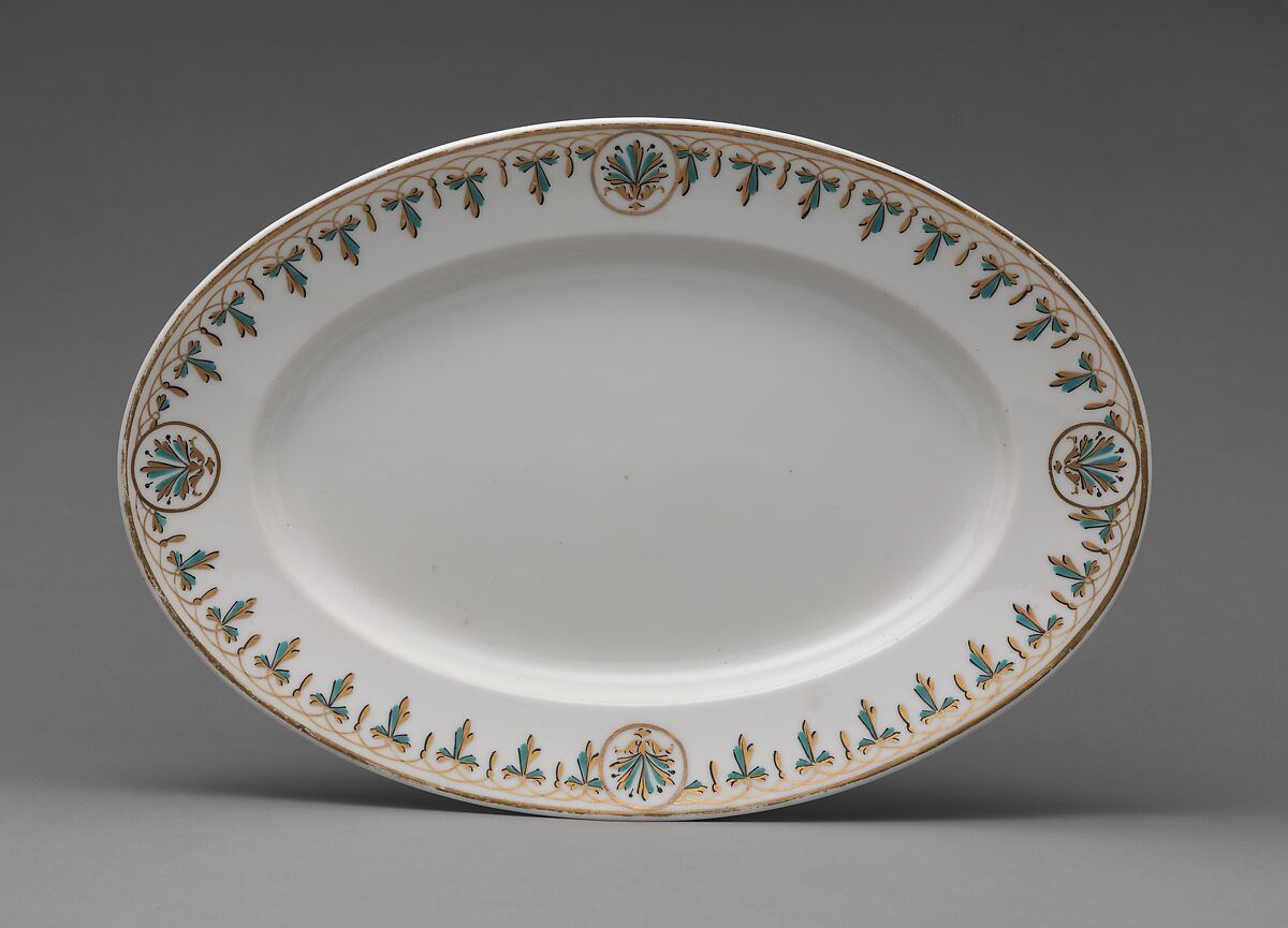Union Porcelain Works was one of the most important and inventive American porcelain manufacturers in the second-half of the nineteenth century. In addition to their imaginative works designed by the German-born artistic director, Karl H. L. Müller, the firm’s mainstay was the production of heavy porcelain hotel dinnerware. This extensive service was made by Thomas Carll Smith, head of the Union Porcelain Works, as a gift to his daughter, Pastora Forest Smith Chace. The neoclassical decoration of the gilt bellflower and basket motif is complimented by turquoise enamel. Unlike the firm’s more eccentric and lavish designs created for their display at the Philadelphia Centennial Exposition in 1876, the pottery favored a more restrained classical style for their dinner services. This service descended in the Chace family.