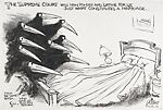 When this cartoon appeared, the Supreme Court was about to hear oral arguments on two landmark cases concerned with same-sex marriage (California’s Proposition 8 and the federal Defense of Marriage Act). To comment, the artist transforms the justices into long-billed birds that have invaded the privacy of a frightened couple’s bedroom.