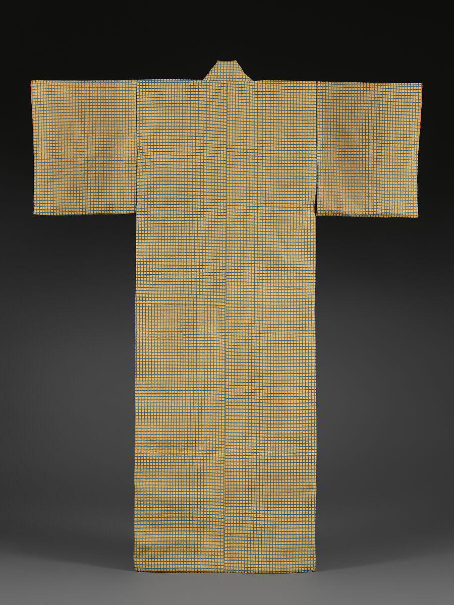 Kimono designs in the early Meiji period were typically subdued. The fabric employed for this example—Awa shijira-ori, distinguished by a peculiar crinkled, crepelike texture (shibo)—is ideal for making casual summertime kimonos. The combination of a dense plain-weave structure with a looser one results in an uneven tension that produces the characteristic surface. First produced in Tokushima Prefecture during the early Meiji period, the textile revived an earlier weaving tradition appreciated in tea culture. Despite the simple checkered or lattice pattern here, the juxtaposition of mustard yellow with indigo blue creates a sense of animation. With his keen interest in unique surface textures and geometric patterns, this kimono must have immediately caught Moore’s eye.