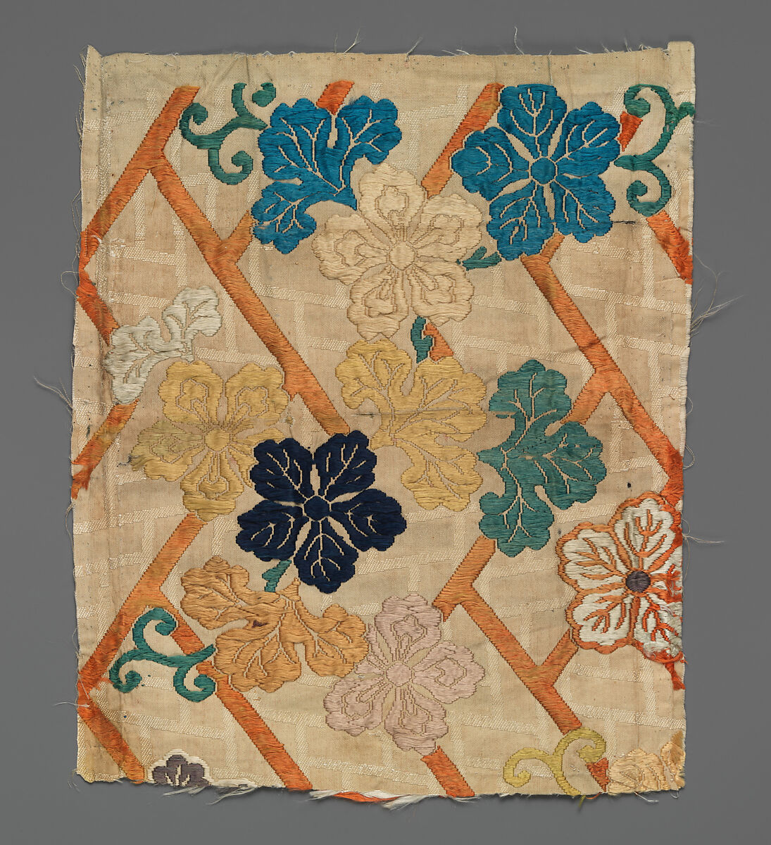 This textile fragment features a pattern with a stylized fence or lattice and moonflowers (yūgao; literally, “evening faces”) of various colors against a white ground. Originally, it may have been part of a Noh theater costume.