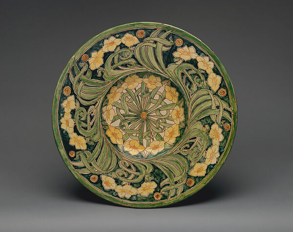 The Della Robbia Pottery in northwestern England was short lived (1894–1906) but it produced an impressive corpus of work during its twelve-year history. Founded on the principals of the Arts and Crafts Movement, the factory sought inspiration in the ceramics of fifteenth and sixteenth-century Florence. This large dish is an excellent example of the factory’s work; technically it looks back to Italian Renaissance ceramic techniques yet it embraces stylistically both the Arts and Crafts and Art Nouveau movements that prevailed at the time.