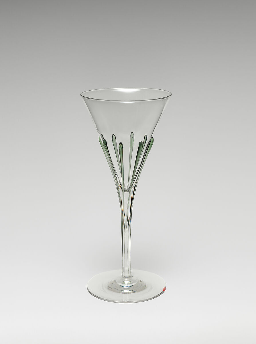 As with Harry Powell’s other designs, this wine glass exemplifies the core philosophy of James Powell & Sons to prize glassmakers’ technique and celebrate the colors and property of their material, rather than to simply depend upon surface decoration and embellishment. The "tear" wine service to which this glass belongs was introduced at the Arts and Crafts Exhibition in 1899. Analysis of contemporary photographs has prompted Evans, Ross and Werner to suggest that the originals had six sea-green tears on clear glass and by 1901 this had been reduced to four tears; afterwards a variety of colors and combinations were used.