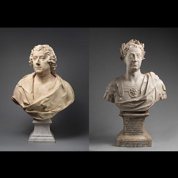 NARRATOR: Flanking the entrance to the gallery you will find sculptures from two émigré craftsmen—among the many great painters, architects, and artisans from the European continent who made their way to London. On the left, you see a masterful depiction of the Duke of Marlborough, famed for fighting the troops of Louis XIV. Here he’s dressed like a hero of the Roman empire, sculpted by the Flemish artist John Michael Rysbrack. On the right, a rendering of the Italian opera singer Francesco Bernardi, or 'il Sinesino,' by French-born Louis-Francois Roubiliac, a member of the thriving community of French Huguenot craftspeople in London. They were talented emigres who contributed to the metropolis's international spirit.