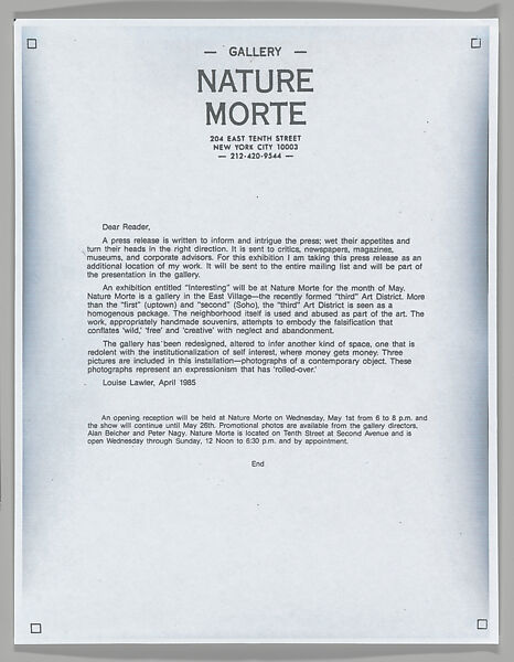 - Title: [Press Release for "Interesting", Nature Morte, New York City]