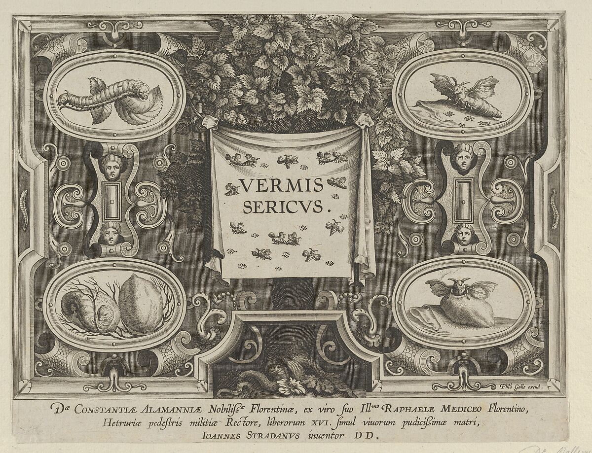 Title plate to the series Vermis Sericus, engraved by Karel van Mallery, after Jan van der Straet, called Stradanus, and published by Philips Galle around 1595. The title is printed on a piece of cloth hanging from a silk tree in the center of the page. It is surrounded by four oval medallions, each depicting a different phase of the metamorphosis of a silkworm. The entire illustration is enclosed in an ornamental frame.