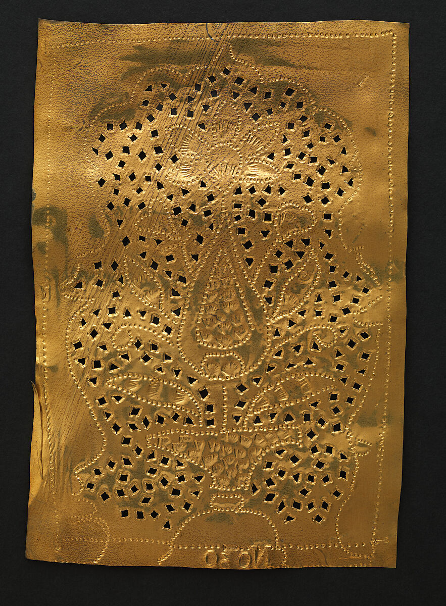 A key figure in the Aesthetic movement, New York-born artist Lockwood de Forest (1850–1932) was very inspired by Indian arts and crafts, and created the Ahmedabad Woodcarving Company in Gujarat, which exported many items to the United States. These cut and chased brass cutouts, designed by de Forest, were based on examples found in wood, plaster, and stone in Indian architecture. In his designs, they would have been used as ornament on architecture or furniture.