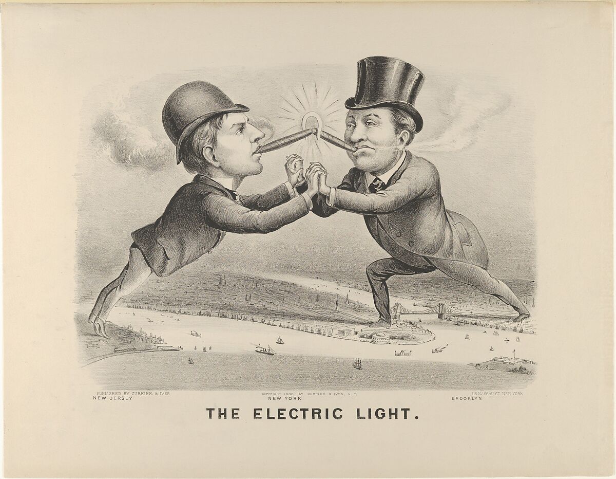 Thomas Edison stands in New Jersey and leans across the Hudson River to join hands with Charles F. Brush, the inventor of the arc light, who stands with one foot planted in Brooklyn the other in Manhattan. The two men touch the tips of their cigars together beneath an electric horseshoe.
