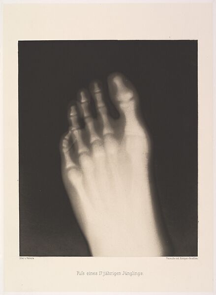 Eder was the director of an institute for graphic processes and the author of an early history of photography. With the photochemist Valenta, he produced a portfolio in January 1896, less than a month after Wilhelm Conrad Röntgen published his discovery of X-rays. Eder and Valenta’s volume, from which this plate derives, demonstrated the X-ray’s magical ability to reveal the hidden structure of living things. Human hands and feet, fish, frogs, a snake, a chameleon, a lizard, a rat, and a newborn rabbit are all presented in exquisitely printed photo-gravures, as are carved cameos and an assortment of natural materials. In an era when photography’s ability to accurately depict the visible world had become commonplace, this newfound capacity to record the invisible opened up a host of possibilities, both scientific and aesthetic. The careful compositions and shocking appearance of these “Experiments in Photography” link them to the previous century’s tradition of natural-history illustration and point toward the experiments of New Vision photographers in the 1910s and 1920s.