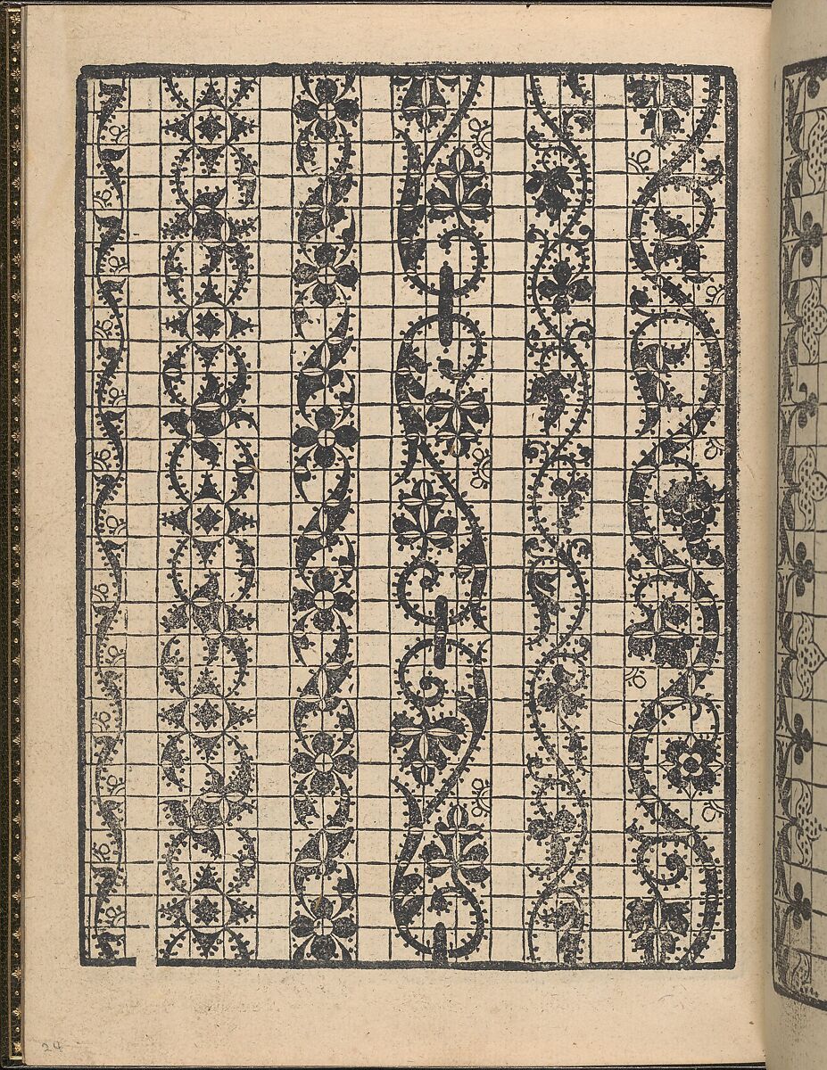 Design composed of 6 vertical columns printed upon a grid. First column is decorated with a curving vine with leaves. Second column is decorated with an alternating pattern of diamonds and vines forming a figure-8 shape. Third column is decorated with an alternating pattern of a 4-petaled flower followed by a leaf. Fourth column is decorated with a pattern of vines with leaves in the form of an ‘S’. Fifth column is decorated with a curving vine with leaves. Sixth column is decorated with a curving vine with leaves, flowers, and grapes.