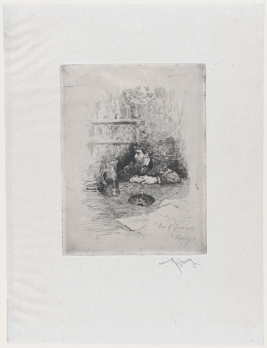 Eduardo Zamacois y Zabala (1841–1871) was a painter of Basque ancestry who, after training in Paris, traveled to Rome in 1866 and befriended Fortuny. The inscription on this print—"A mi q. Zamacois" (to my dear Zamacois)—reflects their friendship. Recognizing Fortuny’s talent as a printmaker, Zamacois introduced him to the publisher Adolphe Goupil in Paris. Goupil offered Fortuny a contract and published all his etchings. The print was made after Fortuny’s reputation as a printmaker had been established. It is possible that he produced it as a token of his thanks to Zamacois for helping him in his career.