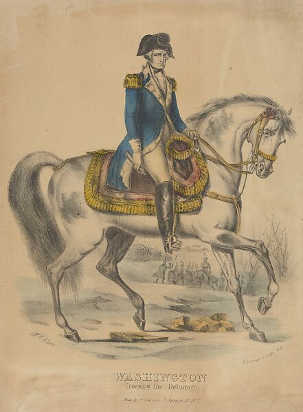George Washington on horseback, holding a small spyglass in his right hand. His troops are depicted behind him on the shore, with others in rowboats on the river, seen through the horse's legs.