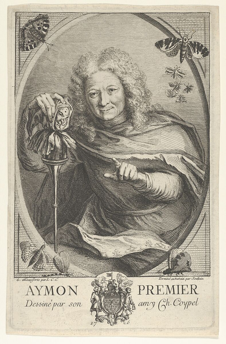 The comte de Caylus was an antiquarian, a writer and an amateur etcher who influenced many artists and collectors of the Rococo period. This charming and whimsical portrait print records a lost drawing by Caylus's friend, the painter Charles Coypel. It represents Étienne-Isidore-Théophile Aymon (1659-1731), portemanteau to the king and co-founder, along with Philibert-Emmanuel de Torsac of a bawdy and comic society, originating in the military, called Le Régiment de la Calotte. The society’s coat-of-arms can be seen in the print just below Aymon’s portrait.