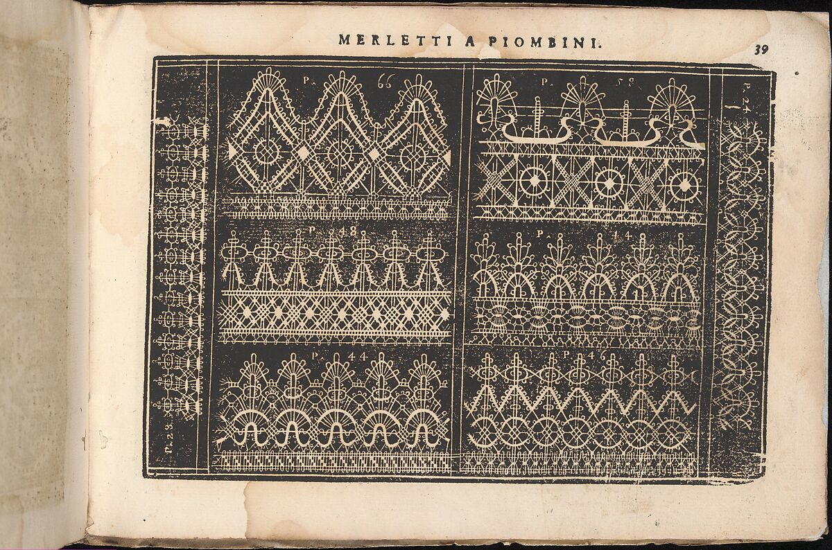 Design consists of a central section that is divided into halves and framed on the left by a decorative border labeled "P. 28" and on the right by a decorative border labeled "P. 24." Left side of middle section is comprised of 3 half-registers that are ornamented with various floral and foliage patterns formed by geometric shapes and curvilinear lines. The registers are labeled in the following order (from top to bottom): "P. 66," "P.48," and "P.44." Similar to the left side, the right side of middle section is comprised of 3 half-registers that are ornamented with various floral and foliage patterns formed by geometric shapes and curvilinear lines. The registers are labeled in the following order (from top to bottom): "P. 58," "P. 14," "P.46."