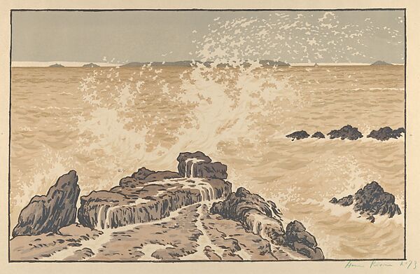 Rivière here conveys the immediacy of a wave crashing against a rock, its dramatic spray of water expressed by the reserve of the paper—areas where no ink is printed. This work continues a theme the artist explored in his first celebrated series of prints, "La mer, études de vagues" (The Sea, Studies of Waves), from 1890−92, based on his observations of the ocean while visiting the northwest coastal region of Brittany. Directly inspired by his study of Japanese ukiyo-e prints, Rivière later translated the aesthetic of his Japoniste woodcuts into the medium of lithography, as seen here.