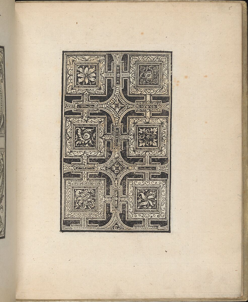 Design is decorated with a pattern of squares connected to rectangles that are then connected to quatrefoils in the center. Each shape is ornamented with a different floral or foliage motif.