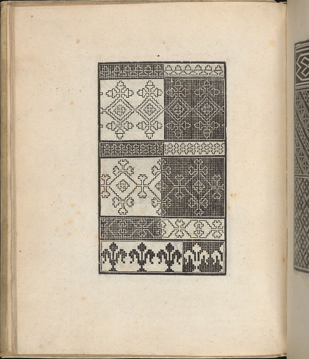 Design composed of 6 horizontal registers that are each divided into halves. Each register is decorated with a different linear or foliage pattern, half of which is printed upon a black gridded background and the other half is printed upon a solid white background.