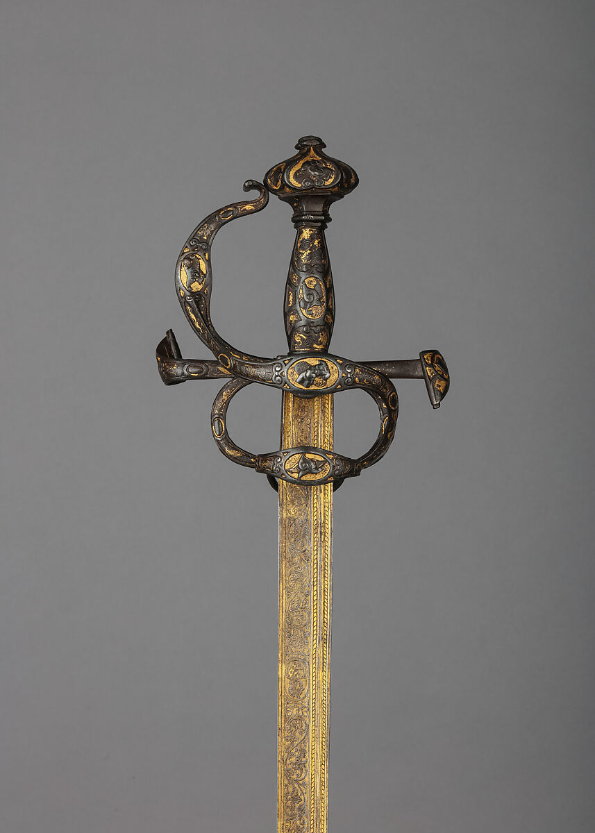 The rapier was the principal civilian sidearm throughout the sixteenth and seventeenth centuries. Designed for cut-and-thrust fencing of progressively complex techniques, the rapier is characterized by a double-edged blade with an acute point and an elaborate guard for the hand. The guards, usually of iron or steel, were subject to a variety of embellishment. They were engraved, chiseled, gilded, damascened, and encrusted in gold and silver in keeping with fashionable styles.