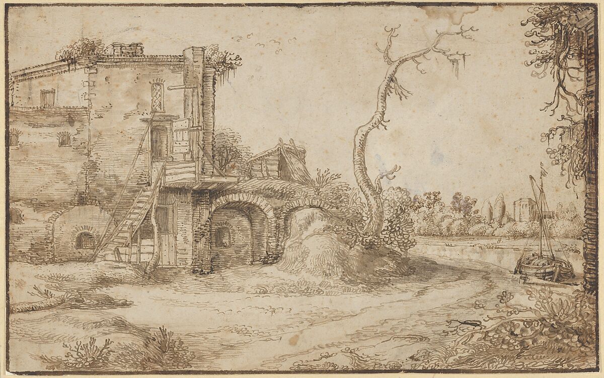 Jan van de Velde II reproduced this drawing, in reverse and with some modifications, for the last of his numerous printed landscape series (see 2014.733.3). Published shortly after Van de Velde’s death by Claes Jansz. Visscher, another enormously important maker of such series, under the title “PLAYSANTE LANTSCHAPPEN ende vermakelycke GESICHTEN” (“Pleasant landscapes and amusing views”), this series features thirty-five views of fields, rivers, and rustic buildings, all evoking the local Dutch landscape.[1] The titlepage of the series, designed by Visscher, explicitly notes that Van de Velde drew the scenes from life (“na t’ leven”). The present drawing, depicting a dilapidated building on the bank of a river (and the corner of a second overgrown structure at far right), is indeed suggestive of direct observation. Rapid marks made with a flat-tipped quill capture the varied textures of grass, leaves, and moss. Touches of brown wash create the illusion of reflections in the surface of the water at right.
