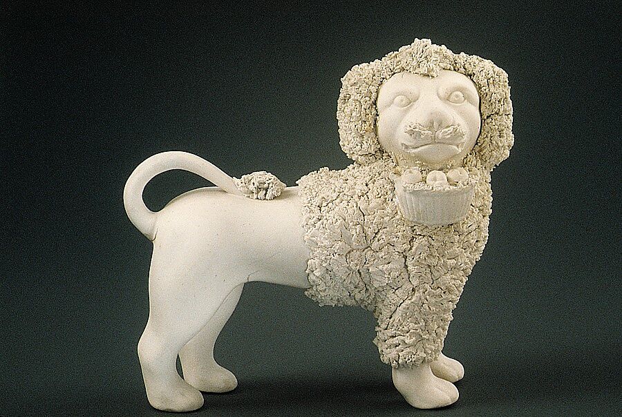 The popular subject of poodles carrying baskets of fruit originated in the Staffordshire section of England before being copied by American ceramists in Parian ware.