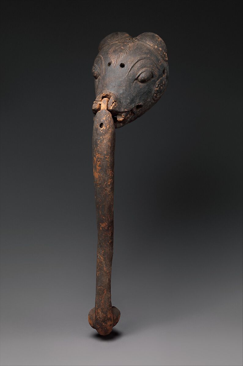 Ganesha, the elephant-headed son of Shiva and Parvati, does not have a role in the Hiranyakashipu story, but his presence on stage brings auspiciousness to the event. He appears before all such performances to ensure their success and provides a prelude to the main narrative. The articulated trunk and ears (now lost) would have given the actor who wore this mask a lively and endearing stage presence.